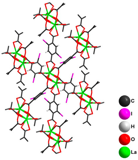 The reorientation of dicarboxylic ligands (Figure 5) leads to a change in the topology of the coordination polymer from 2D to 3D. In the crystal structure of 2, each dimer is connected with six neighboring ones (Figure 6). The crystal packing of 2 (Figure 7) demonstrates the presence of 1D channels in the [001] crystal direction. These channels are decorated by I-atoms potentially accessible for non-covalent interactions with different substrates.