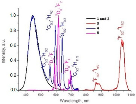 Excitation spectra of complexes registered for most intensive emission line ((1/2)-λem = 445 nm, (3)-λem = 1060 nm, (4)-λem = 601 nm, (5)-λem = 615 nm).