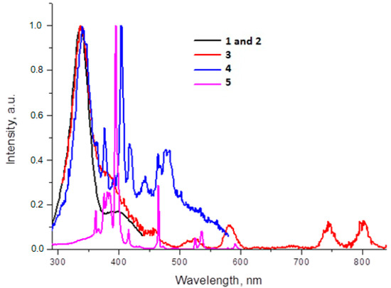 Luminescence of Ln3+ carboxylate complexes has been widely studied in recent years [37,38,39,40,41,42], so we decided to study these features for the 1/2 mixture as well as the pure 3, 4 and 5 phases. The excitation and emission spectra of the complexes (λex = 340 nm) are shown in Figure 8 (see also Figure 9 and Figure 10 for details). The emission spectra of the solid containing 1 and 2 exhibits only the band at 445 nm. Because La3+ is a non-luminescent ion, these spectra show the optical properties of the ligand luminescence [43]. The measured lifetime of the luminescence is τ = 5 ns. The blue emission has the colorimetric coordinates (0.150, 0.128).