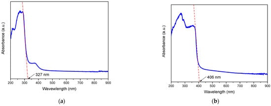 The absorption spectra of the materials were acquired by a UV–Vis DRS (Shimadzu UV-2600, Tokyo, Japan) provided with an integration sphere suitable for diffuse reflectance studies. The UV–Vis DRS spectra were obtained from a wavelength of 200 to 900 nm. From the plot, the band gap energy was calculated using Plank’s Equation (8) [44].