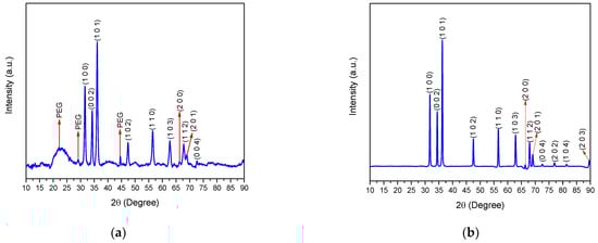 The diffractograms (Figure 4) of the ZnON and ZnOA powder show the wurtzite hexagonal phase of ZnO, corresponding to diffraction signals at 2θ = 31.52°, 34.16°, 36.02°, 47.5°, 56.42°, 62.71°, 66.12°, 67.83°, 68.84°, and 72.65°, with a respective Miller index of (100), (002), (101), (102), (110), (103), (200), (112), (201), (004), and (202) planes (JCPDS No. 89–1397), in agreement with previous works [14,47,48]. On the other hand, the ZnON showed reflection signals around 22.13°, 29.04°, and 44.6° (2θ), which are representative of Zn(OH)2 [49,50,51]. Similar peaks were observed in the diffractograms for PEG at 2θ = 26.19°, 29.16°, and 44.57°, which is consistent with previous reports [52,53]. Some authors have suggested than an incomplete transformation of the precursor to ZnO during synthesis can occur [54,55,56]. Table 1 summarizes the interplanar d-spacing and crystallite size of ZnON and ZnOA. The type of precursor influenced the crystallite size of ZnO: 17.2 nm for ZnON and 31.3 nm for ZnOA with an interplanar d-spacing of 0.2480 and 0.2472 nm, respectively. Al-Dhahir et al. [57] synthesized ZnO nanoparticles using C4H6O4Zn*2H2O with an average crystallite size of 31.5 nm. Likewise, Mesaros et al. [58] reported a crystallite size and interplanar d-spacing of 0.28 nm and 0.32 nm, respectively, in ZnO synthesized through the wet chemical method using zinc acetate as the precursor. Nonetheless, it has been reported that the crystallite size of ZnO prepared by the sol–gel method using zinc acetate ranged from 11.84 to 24.82 nm in a pH-dependent response [59].