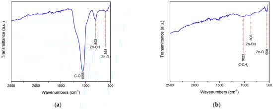 The FTIR spectrum of ZnON and ZnOA after calcination were recorded in the range of 4000 to 400 cm−1 (Figure 5). In general, ZnON and ZnOA exhibited similar absorption regions, in agreement with previous reports [21,60]. Bands at 547 and 558 cm−1 were observed, and the vibrations in these regions are assigned to the Zn-O bond [21]. Signals at 803 and 1055 cm−1 are due to the C=O, C-C, and Zn-OH stretching modes [60,61,62,63]. However, ZnOA showed a noticeable decrease in transmittance at 1055 cm−1 in comparison with ZnON, which could be attributed to the stretching vibration of the residual C-O group present in the salt precursor [64], whereas the peaks around 1023 cm−1 depict the stretching vibration of the C-CH3 bond, associated with the ZnOA precursor [65,66,67].