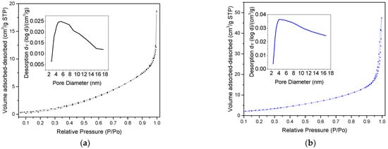 Nitrogen adsorption-desorption isotherms and the corresponding pore size distribution curves (inset): (a) ZnON; (b) ZnOA.