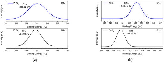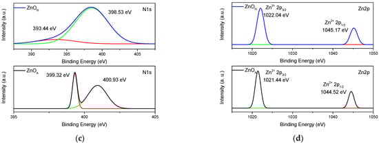 Figure 7 exhibits the XPS spectra of ZnON and ZnOA samples and shows the corresponding signals for carbon (C1s), oxygen (O1s), nitrogen (N1s), and zinc (Zn2p). According to the nature of the precursor, it is expected that some N and C atoms would remain solid after calcination. The two peaks characteristic of Zn2p3/2 and Zn2p1/2 [72,73,74,75] are shown in Figure 7d, for ZnON and ZnOA, respectively. These two signals are observed at 1022.04 and 1045.17 eV for the ZnON sample, whereas those for ZnOA are located at 1021.44 and 1044.52 eV [76]. The Zn2p signals for ZnON are shifted to higher binding energies than those measured for ZnOA. Moreover, the peaks assigned to C1s are displayed in Figure 7a; that for ZnON is located at 285.02 eV, and that for ZnOA is placed at 284.9 eV. The difference indicates a shift to higher binding energies when ZnON is used as a precursor [77]. For the signal corresponding to O1s (Figure 7b), the peaks are located at 533.19 and 530.32 eV for ZnON and ZnOA, respectively, and belong to of the wurtzite crystal structure [78]. The difference demonstrates a move to higher binding energies when using ZnON [72]. From the XPS results, it is clearly observed that a shift to higher binding energies resulted when using Zn(NO3)2 ∗ 6H2O compared to C4H6O4Zn ∗ 2H2O, and this is probably due to the difference in C and N concentrations in both ZnO samples, as discussed below. Moreover, the signal intensity of the C1s is stronger for ZnOA than that observed for ZnON, indicating the presence of carbon on the surface. The nitrogen signals indicated that nitrogen is present in both samples in different arrangements (Figure 7c). Shimizu et al. [79] noted that the nitrogen signals detected in the XPS study were related to the speciation of ammonium at the hematite/water interface. The authors also assigned the N1s peaks at 401.7 for and at 400.1 eV for NH3. In our study, the deconvoluted peaks were located at 393.8, 397.4, 399.2, and 401 eV for both samples and associated with the presence of the NH3 group from the ammonium hydroxide (NH4OH) solution used for the adjustment of pH during the synthesis procedure. The atomic surface composition determined by XPS is shown in Table 2. The C/N atomic ratio was 47.22 and 32.21 for ZnOA and ZnON, respectively. Furthermore, the O/C atomic ratio was 1.47 and 4.15 for the ZnOA and ZnON samples, respectively. The small O/C atomic ratio for ZnOA is probably due to the doping of carbon into the ZnO structure which was the result of the zinc acetate precursor, as was suggested by Lavand and Malghe [75]. The presence of high N and C content in both samples after calcination indicates that N and C absorbed species from the reagents used int the synthesis method on the ZnO samples [79,80]. It is also worth noting that the O/Zn ratio varies; it was 1.28 for ZnOA, whereas it was 2.04 for ZnON. These differences in the C/N, O/C, and O/Zn atomic ratios of the ZnO materials will undoubtedly influence the bandgap energies determined from the UV–Vis spectra.
