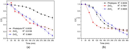 The photocatalytic properties of the ZnO nanoparticles were studied through the degradation of 2,4-D and 2,4-DCP in a typical kinetic reaction experiment. A glass batch reactor provided with a cooling medium, and a UV-lamp of 1 mW cm−2 placed inside a quartz tube was used. The reactor was loaded with 200 mL of deionized water polluted with 80 mg L−1 of 2,4-D or 80 mg L−1 2,4-DCP and 100 mg L−1 of ZnO as a catalyst. The degradation curves were obtained by measuring the evolution of the absorbance maximum (at 283 and 285 nm for 2,4-D and 2,4-DCP, respectively) as a function of time (every 30 min up to 360 min) using a UV–Vis (Shimadzu UV-2600, Tokyo, Japan) spectrophotometer with scans from 200 to 900 nm. Furthermore, the total organic carbon in the samples was measured using TOC-LCSN equipment (Shimadzu, model) and calculated by applying the Equation (11):