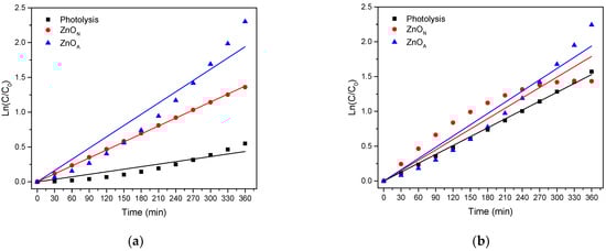 Kinetic study of the photocatalytic degradation of 2,4-D and 2,4-DCP was performed using the Langmuir Hinshelwood (LH) kinetics model. Additionally, Figure 9 shows the kinetic profile of the pseudo-first order reaction for both pollutants. Moreover, the time required for half of the organic compound present in the solution irradiated with UV-light to degrade was calculated [84]. The reaction half-life (t½) can be calculated with Equation (13) by replacing C by C0/2 Equation (1):