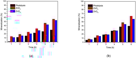The mineralization of the organic pollutants 2,4-D and 2,4-DCP was carried out through total organic carbon (TOC) analysis (Figure 10a,b). In general, the mineralization of the pollutant is dependent on the irradiation time and the photocatalyst precursor.