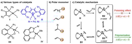 (a) Four conventional catalyst structures [8,9,10,20]. (b) Several different polar monomer structures. (c) The copolymerization mechanism of ethylene/polar monomer meditated by Brookhart-type catalysts II.