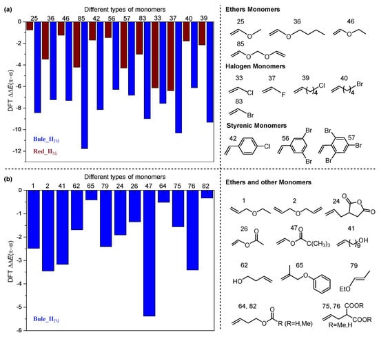 The poisoning effect of several different types of polar monomers (see Figure S2) were explored by DFT calculation and multiple linear regression analysis. Generally, the energy difference ∆∆E(π-σ) (Figure 1c) between double bond coordination and heteroatom coordination is directly related to the poisoning effect. Firstly, the coordination process of a series of polar monomers catalyzed by complex IIPd and IINi were calculated. Through theoretical calculation, it was found that the energy difference of some polar monomers was too high (∆∆E(π-σ) > 0), such as acrylonitrile, methylene spacer vinyl and internal olefin monomers; thus, there are very obvious poisoning effects. On the contrary, the poisoning effect of ether olefins and halogenated olefins is relatively weaker theoretically (∆∆E(π-σ) < 0, Figure 2). However, although the poisoning effect of halogenated olefins is weak (Figure 2a), the β-halide or or β-OR elimination reaction can easily occur in the polymerization, resulting in low polymerization activity [48,49]. For polar monomers 42, 56, 57, this is a kind of styrenic monomers, which are easy to coordinate metal to produce stable and inactive η3-complexes [50]. These results are consistent with the experimental phenomena [51]. Moreover, the number of polar monomers that cannot poison Ni complexes (Figure 2a) is significantly less than that of Pd complexes (Figure 2a,b).