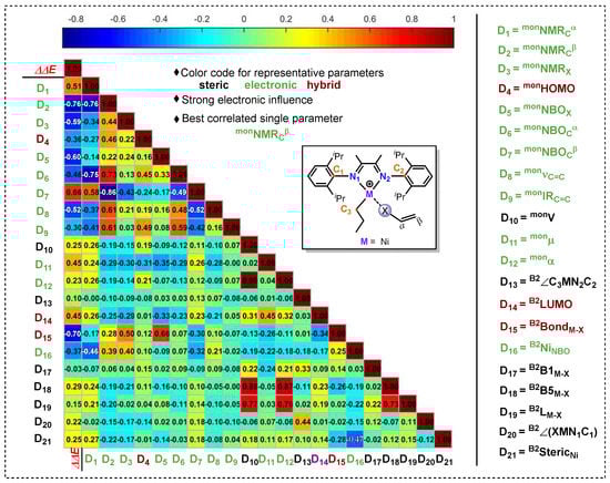 Before the MLR analysis, it is necessary to calculate the electronic and stereoscopic descriptors of different polar monomers by DFT calculation. At present, as hundreds of molecular descriptors are available in the literature [42,43,44,45,46,47,48,49,50,51,52,53,54], we selected a number of them based on our previous experience on olefin polymerization [55,56,57,58] and the literature about MLR analysis of transition-metal-based reactivity. For the predictive effect and the convenience of the MLR model, only one of heteroatom coordination and double bond coordination should be selected for descriptor calculation. Firstly, the descriptors of heteroatom coordination structure B2 and polar monomers are calculated for multivariate linear regression. A total of 21 descriptors were calculated, including Sterimol values [59] (B2B1Ni/Pd-X, B2B5Ni/Pd-X and B2LNi/Pd-X), steric hindrance of metal center (B2StericNi/Pd), bond length (B2bondNi/Pd-X), LUMO (B2LUMO), dihedral angle (B2∠XNi/PdN1C1 and B2∠C3Ni/PdN2C2), Infrared freq (monIRC=C) and Freq Intensities (monvC=C), NMR (monNMRCα, monNMRCβ and monNMRX), NBO (B2NBONi/Pd, monNBOX, monNBOCα and monNBOCβ), Polarizability (monα), HOMO (monHOMO), volume (monV) and Dipole Moment (monμ). Having both computed ∆∆E(π-σ) and descriptors in hand, we performed univariate correlation analysis for the whole data set (87 reactions) to investigate the relationship between descriptors and ∆∆E(π-σ), and to see the variation trends in poisoning effect (by complex IINi). For this purpose, a correlation matrix for the selected parameters was generated, as represented by a color map [60] (Figure 3). As shown in Figure 3, relatively strong correlations were found between ∆∆E(π-σ) and some electronic parameters involving D2 (monNMRCβ, |R| = 0.76), D3 (monNMRX, |R| = 0.59), D5 (monNBOX, |R| = 0.60) and D15 (B2bondNi-X, |R| = 0.70). These descriptors with high correlation coefficient |R| can presumably exert a major influence on ∆∆E(π-σ). Conversely, steric hindrance descriptors exert little effect on ∆∆E(π-σ), such as D17–D21.