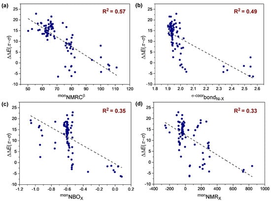 According to the color map in Figure 3, we selected four single parameters D2 (monNMRCβ, |R| = 0.76), D3 (monNMRX, |R| = 0.59), D5 (monNBOX, |R| = 0.60) and D15 (B2bondNi-X, |R| = 0.70) with relatively higher absolute values of R to performed univariate correlation analysis to investigate the relationship between descriptors and ∆∆E(π-σ) and to see the variation trends of poisoning effect. However, when we evaluated the full set of data (87 reactions) in Figure S1, the single parameters cannot describe well the trend of the ∆∆E(π-σ) value (R2 < 0.60, Figure 4), suggesting that multivariate linear regression analysis was required to describe the combined multivariate influences of polar monomers on poisoning effect.