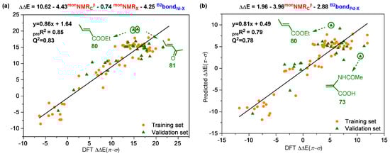 Plot of computed vs. predicted ∆∆E(π-σ) (kcal/mol) for complexes IINi (a) and IIPd (b) using the multivariate linear regression models.