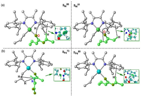 Structure and non-covalent interaction of deviation points in complexes IINi (a) and IIPd (b) systems.