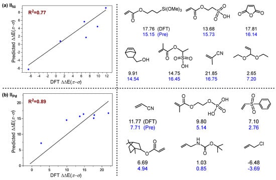 It is worth noting that there were several deviation points in both complexes IINi (a) and IIPd (b) systems (points in green circle, Figure 5a,b), and these deviation points may reduce the prediction accuracy of the MLR model; thus, it is necessary to analyze the origins of these deviation points. Through structural analysis, it was found that these deviation points share something in common, that is, there are obvious non-covalent weak interactions in the σ-coordination structure (Figure 6), including hydrogen bond, H···π interactions and heteroatom···π interactions. In order to confirm the effect of non-covalent weak interaction on energy of σ-coordination structure, the aromatic ring on the ligand was substituted with methyl, and the ΔΔE(π-σ) was calculated (Figure S4). By comparing the calculation results, it can be seen that the non-covalent weak interaction between polar monomers and aromatic ring on ligands exerted an obvious effect on the energy of ΔΔE(π-σ), but the non-covalent weak interaction is not considered in above descriptors. Therefore, there is a certain deviation in the prediction results of the system with obvious non-covalent weak interaction. Furthermore, external validation of the MLR model for the complex IINi (a) and IIPd were performed separately; results are shown in Figure 7. These results indicate that these MLR models have certain extrapolation and prediction ability. It is noted that some monomers containing an active hydrogen or a strong electrophilic group could undergo side reactions in the polymerization system rather than polymerize. However, these monomers were considered for expending the scope of data set and were helpful for constructing the prediction models [61,62,63]. It is also noteworthy that there may be secondary interactions between polar monomer molecules in the polymerization system [4,64]. Our work mainly focuses on the influence of the electronic or stereoscopic effect of the monomer itself on the poisoning effect of the catalyst. The actual experimental reaction system was very complex; there will be a variety of interactions. In order to explore the main reasons affecting the poisoning effect, this work simplifies the experimental conditions and provides a valuable reference for experimenters to screen suitable polymerized monomers.