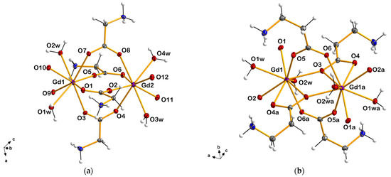 (a) Detail of the dinuclear [Gd2(gly)6(H2O)4]6+ unit in 1; (b) Detail of the dinuclear [Gd2(β-ala)6(H2O)4]6+ unit in 2. In both cases, perchlorate anions and non-coordinating water molecules were omitted for clarity. Thermal ellipsoids are depicted at the 50% probability level.