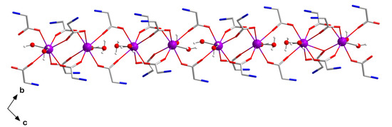 View of the one-dimensional motif of the homometallic {[Gd2(gly)6(H2O)4](ClO4)6·5H2O}n chain in 1. Perchlorate anions and non-coordinating water molecules were omitted for clarity. Colour code: violet, Gd; red, O; blue, N; grey, C; white, H.