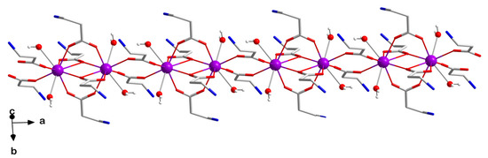 In complex 2, two GdIII ions are connected between them through four bridging carboxylate groups from four β-alanine (β-ala) ligands to form the dinuclear [Gd2(β-ala)6(H2O)4]6+ unit. The two GdIII ions are distanced from each other by an average separation of ca. 4.008 (1) Å (Figure 1), (the symmetry codes for the Gd (1)···Gd (1a) and Gd (2)···Gd (2b) distances being (a) = −x, 1 − y, −z and (b) = 1 − x, − y, 1 − z, respectively). Additional β-ala ligands link adjacent dinuclear units with separations of 5.196 (1) [Gd (1)···Gd (1c); (c) = 1 − x, 1 − y, −z] and 5.203 (1) Å [Gd (2)···Gd (2d); (d) = 2 − x, − y, 1 − z], generating a cationic 1D coordination polymer that grows along the crystallographic a-axis (Figure 3).