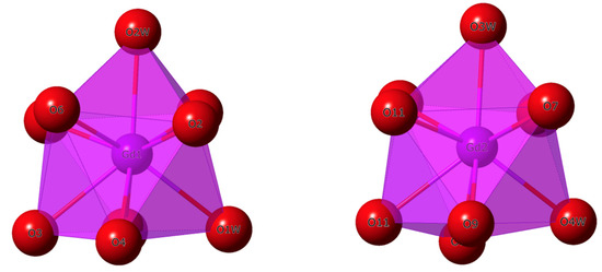 The coordination environment and geometry of the GdIII ions in 1 and 2 were further analyzed through the SHAPE program [31,32,33]. In 1, the two GdIII ions show a coordination number equal to eight (Figure 1). The lower computed value for Gd (1) was 0.732, which was associated with a bicapped trigonal prism (BCTPR) geometry (Table 2). For Gd (2), however, a value of 0.915 was assigned to a square antiprism (SAPR) geometry (Figure 4 and Table 2). These features would suggest different geometries for the metal centers Gd (1) and Gd (2) in compound 1 (Figure 4).