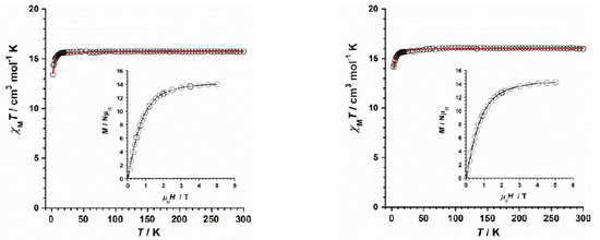 Dc magnetic susceptibility measurements were carried out on microcrystalline samples of 1 and 2 in the 2–300 K temperature range and under an external magnetic field of 0.5 T. In order to keep the samples both immobilized and well isolated from the moisture of the air at all moments, the organic compound eicosene was used. The χMT versus T plots (χM being the molar magnetic susceptibility per two GdIII ions) for compounds 1 and 2 are given in Figure 6. At room temperature, the χMT values are ca. 15.7 (1) and ca. 15.9 cm3mol−1K (2), which are very close to that expected for two magnetically uncoupled GdIII ions (4f7 ion with gGd = 2.0, SGd = 7/2 and LGd = 0) [34]. Upon cooling, the χMT values approximately follow the Curie law with decreasing temperature to ca. 20 K, before they decrease reaching minimum values of approximately 13.4 (1) and 14.0 cm3mol−1K (2) at 2 K. The decrease in the χMT value observed for both compounds would likely be assignable to antiferromagnetic interactions and/or small zero-field splitting (ZFS) effects [20,21].