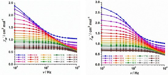 Ac magnetic susceptibility measurements were performed on 1 and 2 in the temperature range of 2–25 K and in a 5.0 G ac field oscillating at different frequencies. No out-of-phase ac signals (χ″M) were observed at Hdc = 0 G, which may be caused by a very fast Quantum Tunnelling of Magnetization (QTM) in 1 and 2. Nevertheless, out-of-phase ac signals were observed in both compounds when an external dc magnetic field (the optimal field being Hdc = 2500 G) was applied. This applied dc magnetic field suppresses QTM and breaks the Kramer’s doublet, leading to the observed slow relaxation [17,20,21]. In this way, both compounds show field-induced slow relaxation of magnetization, which is indicative of single-molecule magnet (SMM) behavior [4,7]. This magnetic relaxation observed for 1 and 2 was studied through both in-phase (χM’) and out-of-phase (χM″) ac susceptibilities versus frequency (ν/Hz) plots, which are given in Figure 7 and Figure 8, respectively. The experimental data of the maxima in 2 display higher intensity than those of 1, even though similar relaxation dynamics could be a priori expected for both compounds.