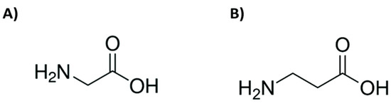 Molecular structure of the amino acids α-glycine (A) and β-alanine (B).
