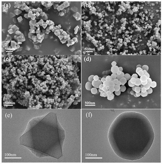 SEM images of (a) 220-MIL-101, (b) 200-MIL-101, (c) 180-MIL-101, and (d) 160-MIL-101. HRTEM images of (e) 200-MIL-101 and (f) 160-MIL-101.