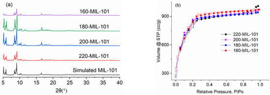 The N2 adsorption–desorption isotherms of 220-MIL-101, 200-MIL-101, 180-MIL-101, and 160-MIL-101 were presented in Figure 2. 160-MIL-101 showed the highest BET surface area of 3021 m2 g−1, 200-MIL-101 and 180-MIL-101 showed slightly smaller BET surface areas of 2926 and 2909 m2 g−1, respectively. While 220-MIL-101, which followed the initial literature [19], displayed the lowest BET surface area of 2862 m2 g−1 (Table 1). Interestingly, the yields of all samples were over 50%, which was higher than the reported HF route (~50%) [32,33,34]. Most notably, with 200-MIL-101, the yield was above 95%, which might be the highest value ever reported. Hence, the additive-free route for MIL-101(Cr) at lower temperatures could be considered as an alternative for industrial production.