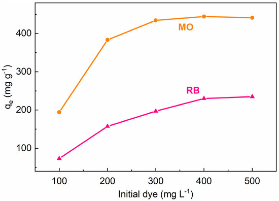 Adsorption uptakes of 160-MIL-101 toward MO and RB after 24 h, as determined by dispersing 5 mg of 160-MIL-101 in the aqueous dye solution (100 mg L−1 to 500 mg L−1) at ambient temperature (25 °C).