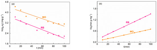 To investigate the process of dye adsorption by the adsorbent, pseudo-first-order and pseudo-second-order kinetic models were adopted to fit the adsorption data [46,47], respectively. The linear expressions of the pseudo-first-order kinetic equation and the pseudo-second-order kinetic equation were shown in Equations (2) and (3) [48,49]