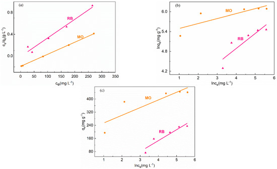 where qm (mg g−1) and kL (L mg−1) represent the maximum adsorption capacity of adsorbents and Langmuir constant, separately; the kF [(mg g−1)(L mg−1)1/n] and n are Freundlich constants representing adsorption capacity and adsorption intensity, separately; B = (RT/b) is related to the heat of adsorption, and A (L g−1) is the equilibrium constant.