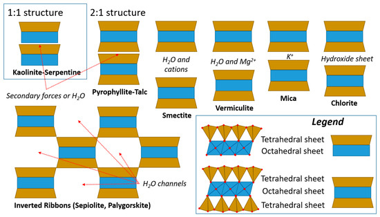 An extended classification of clays based on their chemical composition, structural stacking, and interlayer organization is summarized in Figure 1 [2]. In detail: