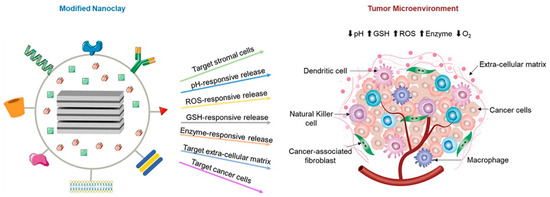 Schematic illustration of strategies used to expand the functions of nanoclays. The modified-nanoclays target the tumor microenvironment (TME), increasing the efficacy of cancer therapy. TME has been shown to have different characteristics from normal tissues, which can be vascular defects, higher expression of given enzymes, elevated glutathione (GSH), hydrogen ion, and reactive oxygen species (ROS) concentrations. Reprinted with permission from [9]. Copyright 2021 Elsevier B.V.