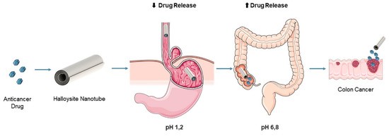 Schematic illustration of a pH-responsive nanoclay system for anticancer drug delivery to the intestines, avoiding early release in the stomach. Reprinted with permission from [9]. Copyright 2021 Elsevier B.V.