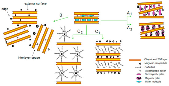 - Intercalation: This method consists in the physical insertion of target chemical species within the interlayers/pores of the clays [122]. In this specific context, the mechanisms proposed are two: either the inclusion of magnetic nanoparticles within a previously surfactants-intercalated clay to facilitate the entrance of the magnetic nanoparticles (Figure 4, route C1) or the direct intercalation of surfactant-stabilized magnetic nanoparticles (Figure 4, route C2) [10].