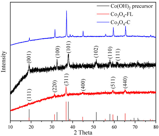 XRD patterns of the as-prepared Co(OH)2 precursor, Co3O4-FL, and Co3O4-C.