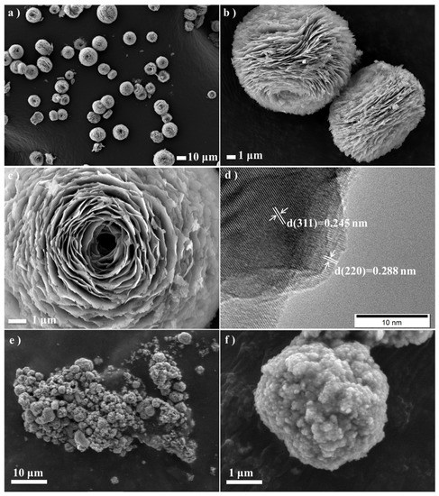 Figure 2 shows the SEM and high-resolution (HR)TEM images of the Co3O4-FL and Co3O4-C. Figure 2a shows that most Co3O4-FLs are monodispersed microspheres with a diameter size of 10–15 μm. Closer observations show that these hierarchical microspheres are composed of large numbers of nanosheets with smooth surfaces (Figure 2b,c). The HRTEM image of the Co3O4-FL is presented in Figure 2d. The dominant exposed planes are {112}, which are the only planes displayed in both the set of (220) planes with a lattice space of 0.288 nm and the set of (311) planes with a crossing lattice space of 0.245 nm [16]. Co3O4-C, on the other hand, has no definite shape, and just agglomerates nanoparticles (Figure 2e,f).