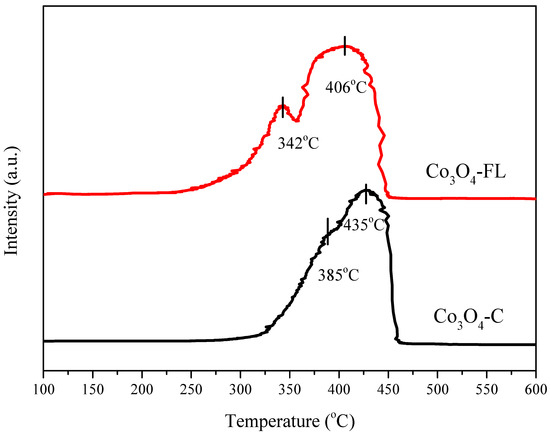 The H2-TPR profiles show two reduction peaks on both the Co3O4-FL and the Co3O4-C catalysts (Figure 3). This figure shows overlapping peaks at 385 and 435 °C, observed on Co3O4-C, which are assigned to the reduction of Co3+ into Co0. However, there are two peaks in the Co3O4-FL catalyst at 342 and 406 °C, indicating the successive reduction behavior of Co3+ to Co2+ and Co2+ to Co0, in two reduction steps. Additionally, the temperature of the reduction peaks over Co3O4-FL is lower than that over Co3O4-C, which could imply that the Co3O4-FL composed of nanosheets presents the better reducibility, whereby the more susceptible to reduction an oxide is, the more easily it can generate oxygen vacancies [17].
