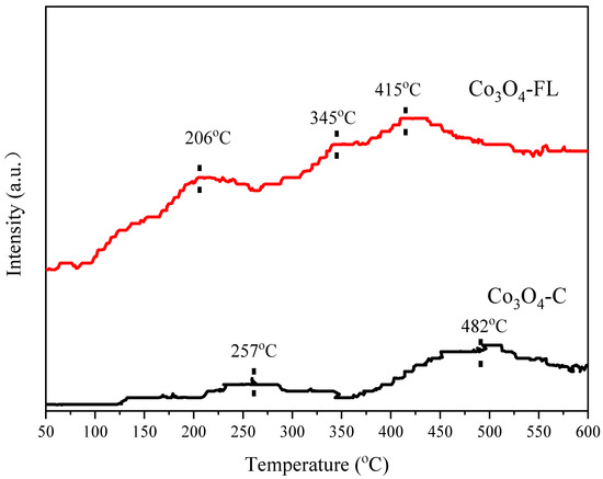 The O2-TPD of catalysts was carried out to evaluate the mobility of oxygen species, as shown in Figure 4. Generally, there are four oxygen species on the surfaces of metal oxides, with the release order: O2 (molecular oxygen) → O2− (superoxide anion) → O− (oxygen anion) → O2− (lattice oxygen). The physically adsorbed O2 species can be desorbed below 200 °C. The O2− and O− species are chemically adsorbed oxygen, which can be liberated in the range of 200–400 °C. The rest of the O2− species are attributed to surface and/or lattice oxygen released above 400 °C [18]. It seems that the Co3O4-FL catalysts present desorption peaks at 206 and 345 °C, which can be attributed to the desorption of O2− and O− species, respectively, whereas another peak is located at 415 °C, which can be assigned to the desorption of O2− species. The desorption temperature of the Co3O4-C catalysts shifts from 206 to 257 °C, and from 415 to 482 °C, respectively, indicating that the desorption of O2−, O−, and O2− species was facilitated, implying an enhancement in the catalytic activity of Co3O4-FL through a suprafacial mechanism.