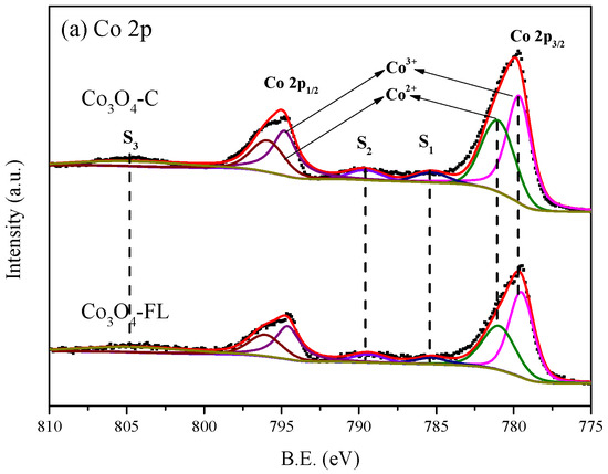 The spectra of Co 2p and O 1s are displayed in Figure 5a,b, illustrating the chemical surface compositions and valence states. The BE value of Co 2p3/2 is 779–780 eV, and a 2p1/2 splitting of 15 eV is characteristic of the octahedral Co3+ component of Co3O4 [19]. The satellite peaks at 785 eV evidence the existence of Co2+ species in the octahedral sites [20,21]. Here, the Co 2p spectra were resolved using a fitting procedure partially based on that suggested by Biesinger et al. [22]. The contributions of the Co3+ and Co2+ cations can be identified at 779.5 and 781.1 eV, respectively [23]. Additionally, two satellite peaks, S1 and S2, at 785.3 and 789.4 eV, appeared due to electron correlations and the final state effects in the Co2+ and Co3+ cations, respectively [24]. Meanwhile, the satellite peak S3 indicates the spin orbit contributions of Co 2p1/2, as do the satellites S1 and S2 [25,26]. The O 1s spectra in Figure 5b are also decomposed into two peaks. The peaks located at 529.7 and 531.2 eV can be ascribed to lattice oxygen (Olatt, i.e., O2-) and oxygen adsorbed onto the surface oxygen vacancies (Osur, i.e., O−, O22−, and OH−), respectively [27].