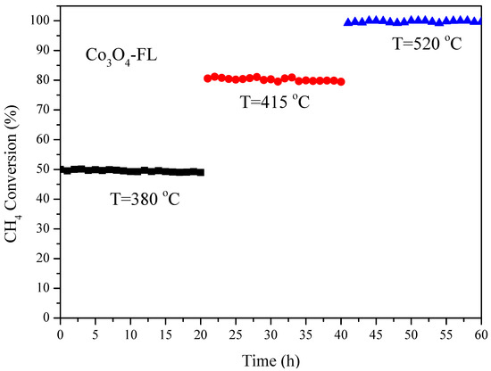 The effect of methane oxidation on Co3O4-FL and Co3O4-C catalysts is depicted in Figure 6. It seems that the activity is influenced by the different morphologies. The temperatures for the 50% conversion of methane (T50) and 90% conversion of methane (T90) in Co3O4-FL are 380 and 430 °C, respectively, which are much lower than these temperature values for Co3O4-C at the same conversion rate. This can be explained by the relatively high specific surface area, the greater number of active surface oxygen species, and the higher reducibility of highly exposed Co3O4-FL. Interestingly, Co3O4-FL showed nearly identical T50 and T90 values in the first three recycles, indicating the robust catalytic stability of Co3O4-FL. Meanwhile, other thermal stability tests were carried out at T50, T80 and T100 under the same catalytic conditions (Figure 7). The values of T50, T80 and T100 within the 20 h tests were 380, 415, and 520 °C, respectively, without variation. This result confirms that Co3O4-FL has excellent thermal stability, suggesting its great potential practical applicability.