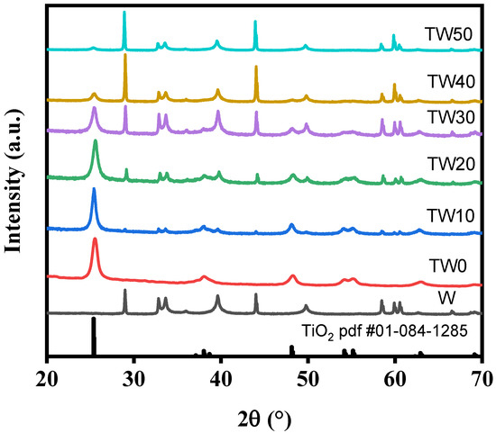 XRD for W, TW0, TW10, TW20, TW30, TW40 and TW50 nanofibers of TiO2:WS2 (0:1, 1:0, 0.9:0.1, 0.8:0.2, 0.7:0.3, 0.6:0.4 and 0.5:0.5, respectively).