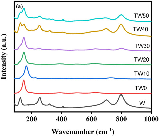The WS2/TiO2 nanofibers with different ratio between tungsten disulfide and titanium dioxide were observed with the use of Raman measurements. Moreover, Raman spectra of the prepared nanofibers are presented in Figure 2. In W sample, the bands at 126.28, 255.03, 320.11, 409.71, 701.09 and 799.35 cm−1 can be ascribed to the vibration bands of WS2 nanosheets [14,15]. For pure TiO2 sample, the bands observed at 147.41, 198.17, 389.58, 502.31 and 626.37 cm−1 in the Raman spectrum can be assigned to E1g, E2g, B1g(1), B1g(2) + A1g and E3g modes of anatase, respectively [16]. The combination of WS2 with TiO2 (in TW10, TW20, TW30, TW40 and TW50) resulted in a slight change in the anatase bands. In TW40 and TW50, the main band of anatase at 150 cm−1 is significantly changed due to the overlapping between the bands of TiO2 and WS2 and it means that there is a high conjugation between TiO2 and WS2.