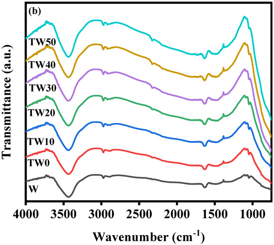 (a) Raman spectra and (b) FTIR for TW0, TW10, TW20, TW30, TW40 and TW50 nanofibers.