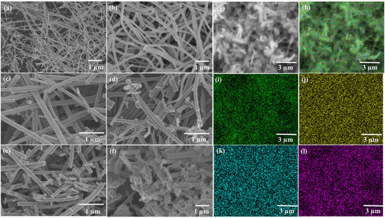 SEM images for (a) TW0, (b) TW10, (c) TW20, (d) TW30, (e) TW40 and (f) TW50 nanofibers; (g,h) Images of SEM/EDX elemental mapping of TW40 (i) oxygen, (j) titanium, (k) tungsten and (l) sulfur in TW40.