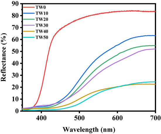 UV-Vis diffuse reflectance spectra of TW0, TW10, TW20, TW30, TW40 and TW50 nanofibers.