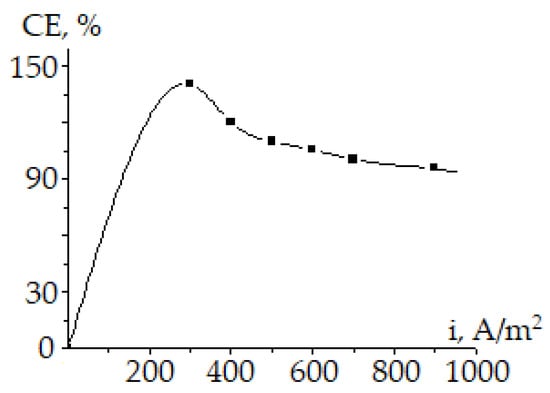Figure 1 and Figure 2 show the dependence of the current efficiency (CE) of the reduction in selenate ions with the production of selenium powders on the current density on titanium electrodes and the concentration of sulfuric acid. The current efficiency decreases with an increase in current density, and on the contrary, current efficiency increases with an increase in acid concentration. It should be noted that at a current density equal to zero, i.e., in the absence of polarization, the current efficiency value is zero, since titanium is always covered with an oxide film and does not undergo an oxidation reaction. This indicates that the reduction in selenate ions proceeds only when titanium electrodes are polarized by alternating current.