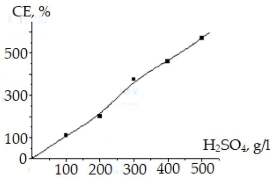 Dependence of selenate ion reduction current output on the concentration of sulfuric acid: i = 500 A/m2; = 15 g/L; t = 20 °C.