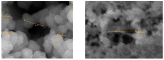 The obtained experimental data indicate that when the titanium electrodes are polarized by an alternating current with a frequency of 50 Hz, selenium (VI) is reduced with an apparent high current efficiency. In this case, selenate ions are reduced to produce ultrafine selenium powders. As can be seen from the photograph (Figure 3), ultrafine selenium powders are produced with spherical particles having dimensions of no more than 1.0 μm.