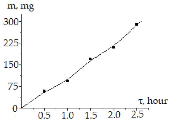 The change in the mass of titanium electrodes during the selenium (VI) reduction on the duration of electrolysis: i = 500 A/m2; = 15.0 g/L; Se(VI) = 6.0 g/L; t = 20 °C.