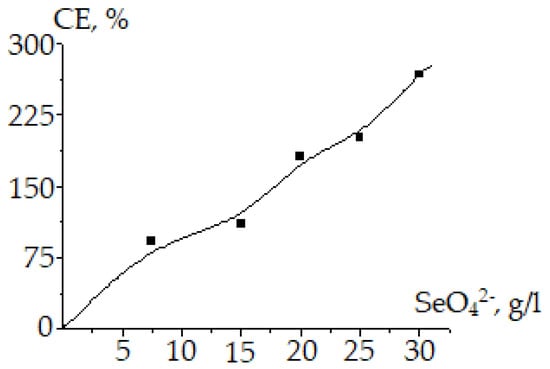 Influence of the initial concentration of selenate ions on the current efficiency of selenium powders production: H2SO4 = 100 g/L; i = 500 A/m2; τ = 0.5 h; t = 20 °C.